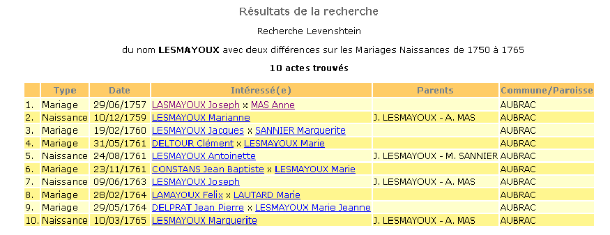 Si vous ne trouvez pas votre bonheur modifiez ou les différences ou les critères de date. Mais progressivement, et en fonction des noms que vous recherchez ! (Si vous cherchez avec 5 différences sur un nom de 5 lettres dans une base assez conséquente vous allez récupérer des milliers de noms inutiles)